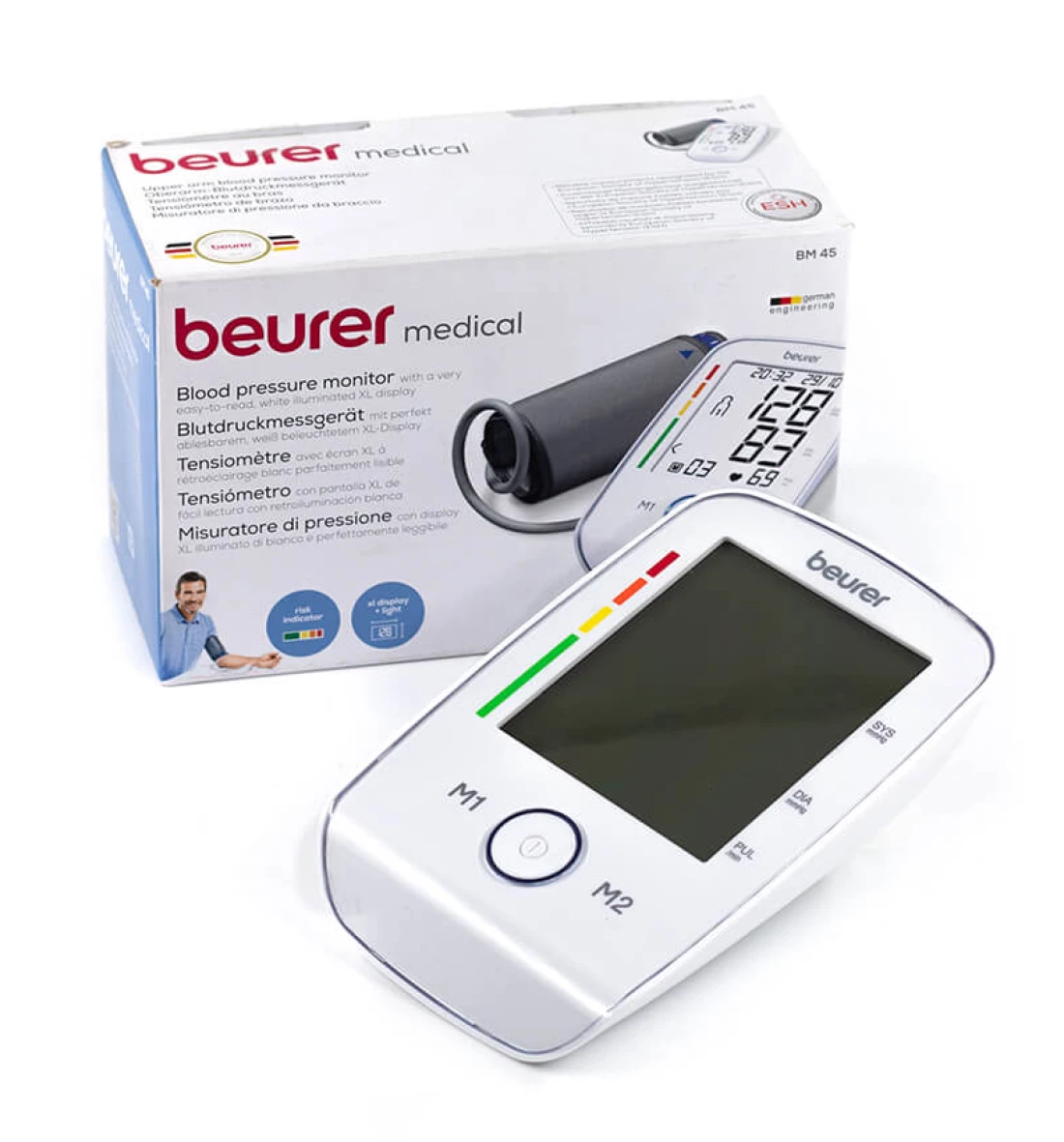 طراحی زیبا با لبههای نقرهای، صفحه نمایش خوانا با نور پسزمینه سفید و عملکرد سریع باعث شده مدل BM45 یکی از پرفروشترین و کاربرپسندترین فشارسنجهای خانگی بیورر باشد.